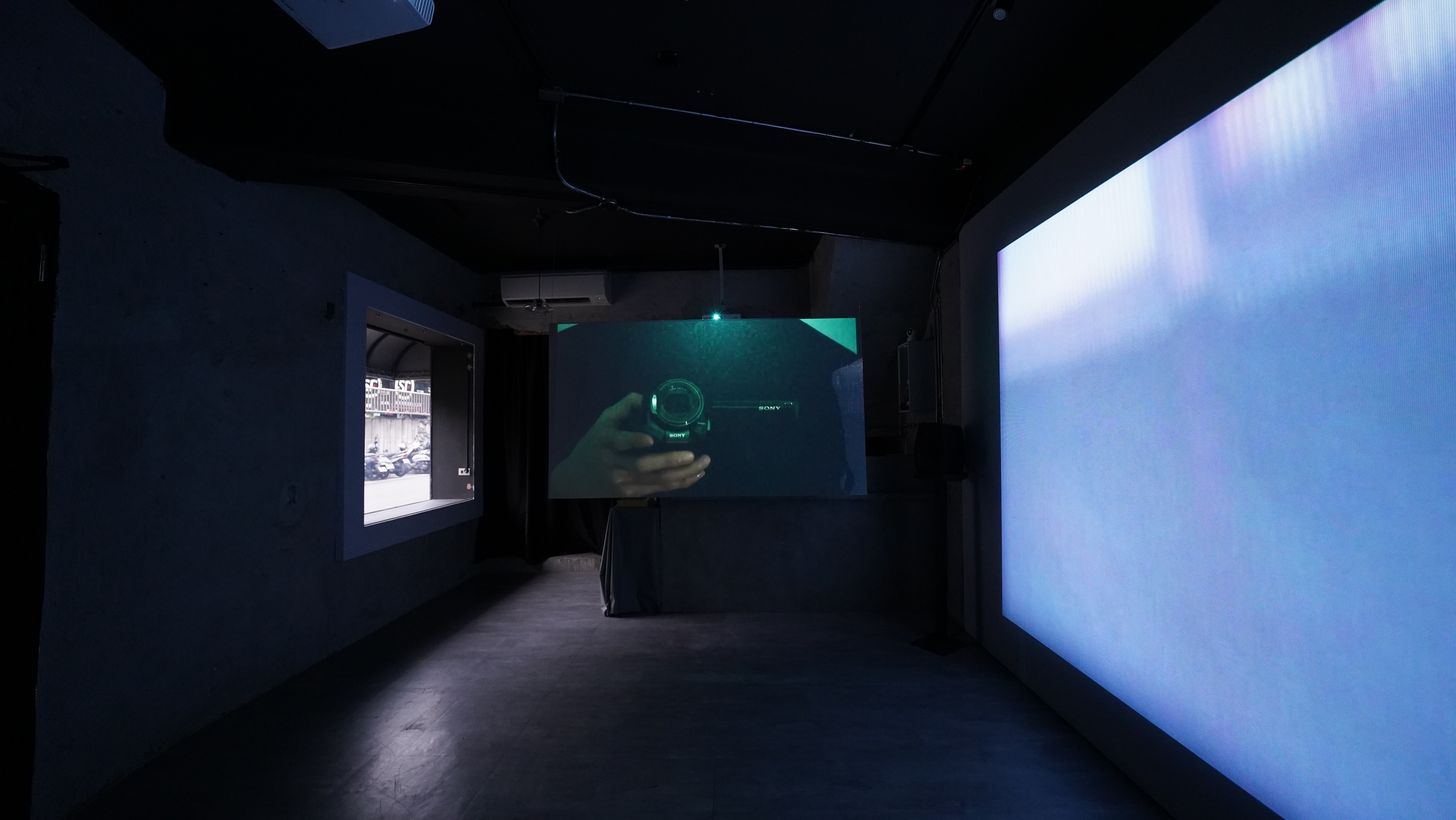 I projected three images on three walls of a space. The images are based on two films by Edward Yang, "Taipei Story " and "Terrorizers", and the other from a video I shot of the actual urban space. Through the framing of a hand-held camera to capture the "Image Coating" in the space, and the use of a hand-made Electro-magnetic Microphone to pick up the magnetic fields emitted by electronic devices. The montage of indoor and outdoor scenes in the film is reconnected by direct filming through the displacement of the body, and the separation between the "inside" and "outside" of the space is opened up to an overlapping and juxtaposed path.