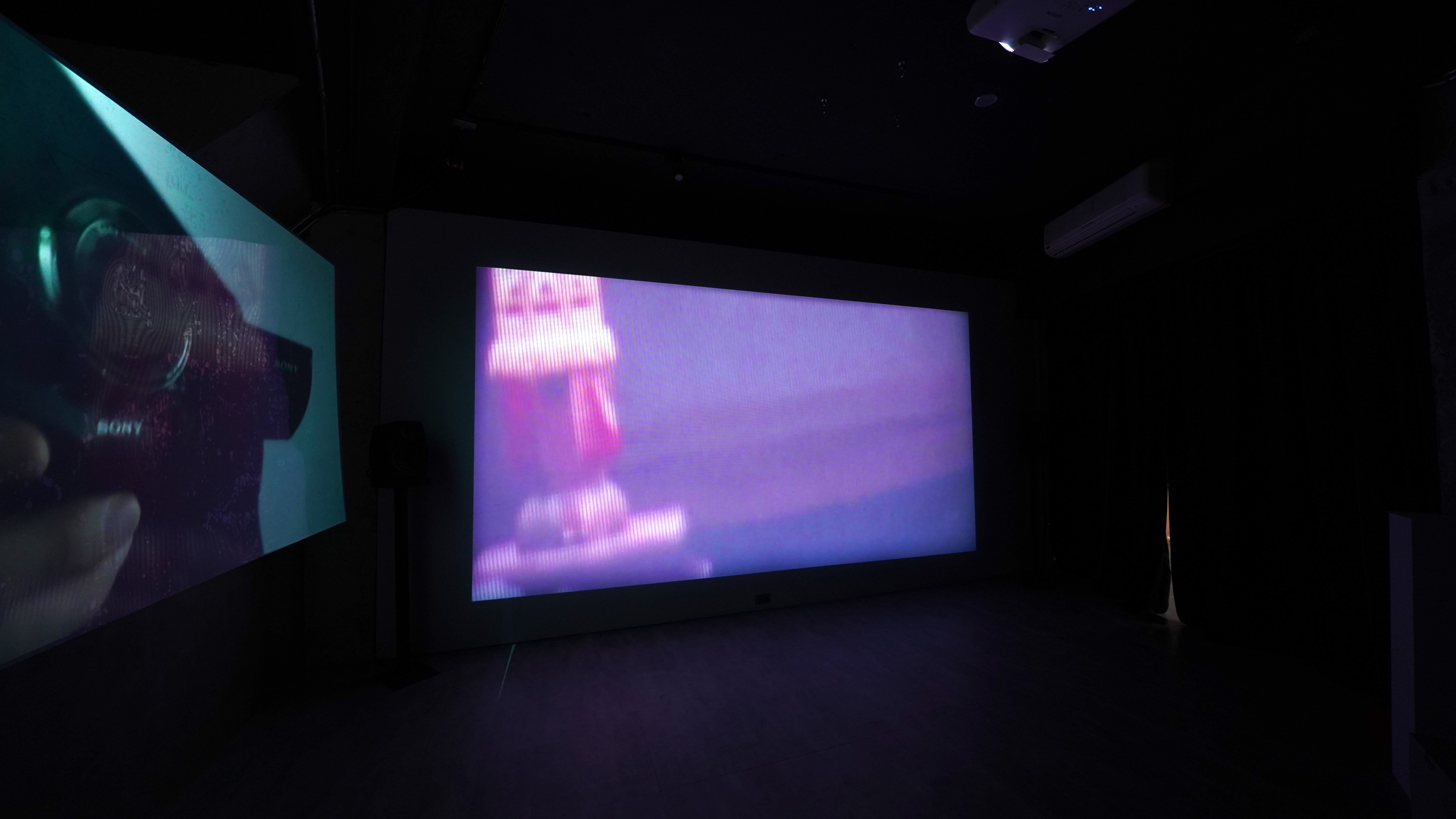 我將兩個影像分别投影於空間的牆面上,影像取材於楊德昌的兩部電影《青梅竹馬》及《恐怖份子》。透過手持攝影機的框景去「剪接」空間中的「影像塗層」,並利用自製的電磁波麥克風(Electro-magnetic Microphone)收取播映端的聲音電磁訊號。我以「觀看機制關係的人」為視角化作眼睛游離於影像的表面,並試圖鬆動空間中影像的「內部」與「外部」通向一條交疊並置的路徑。